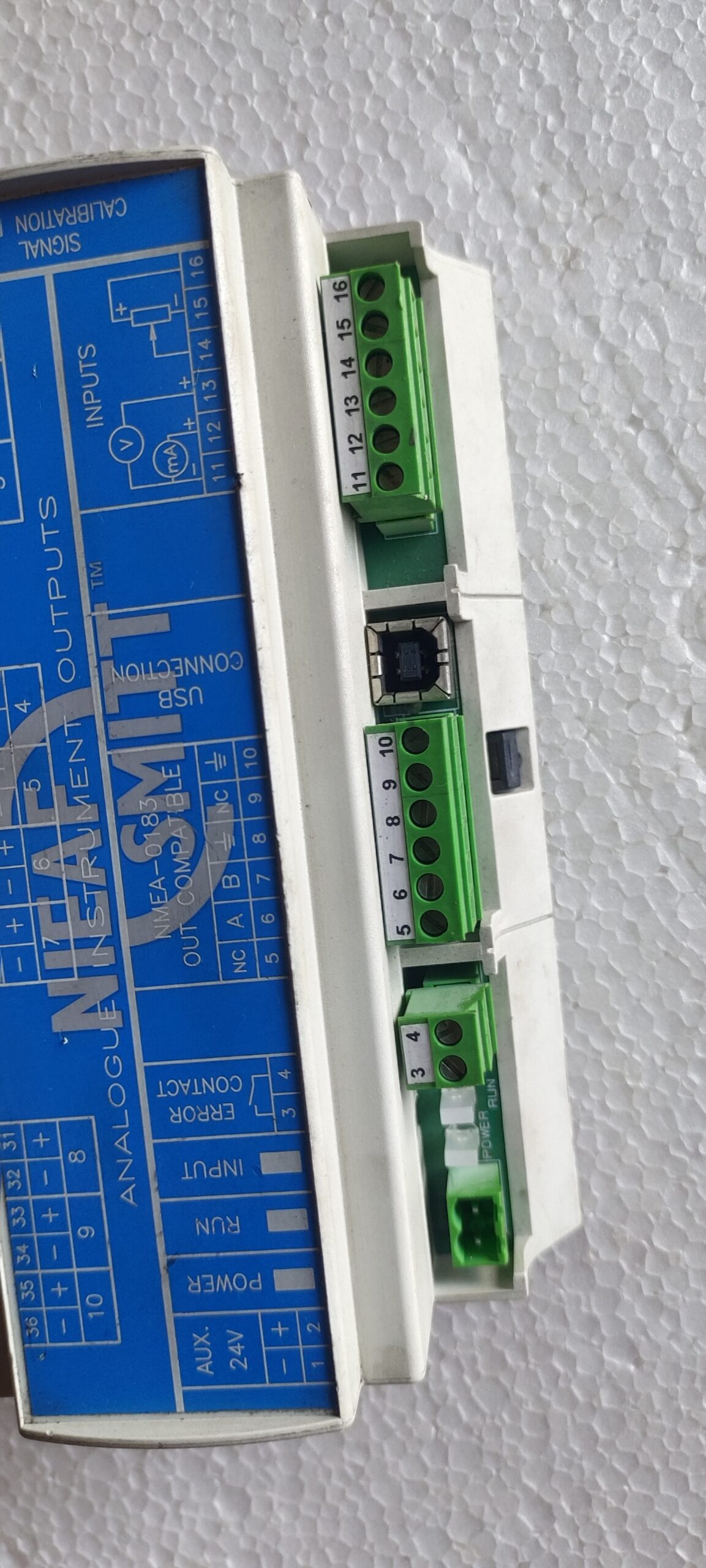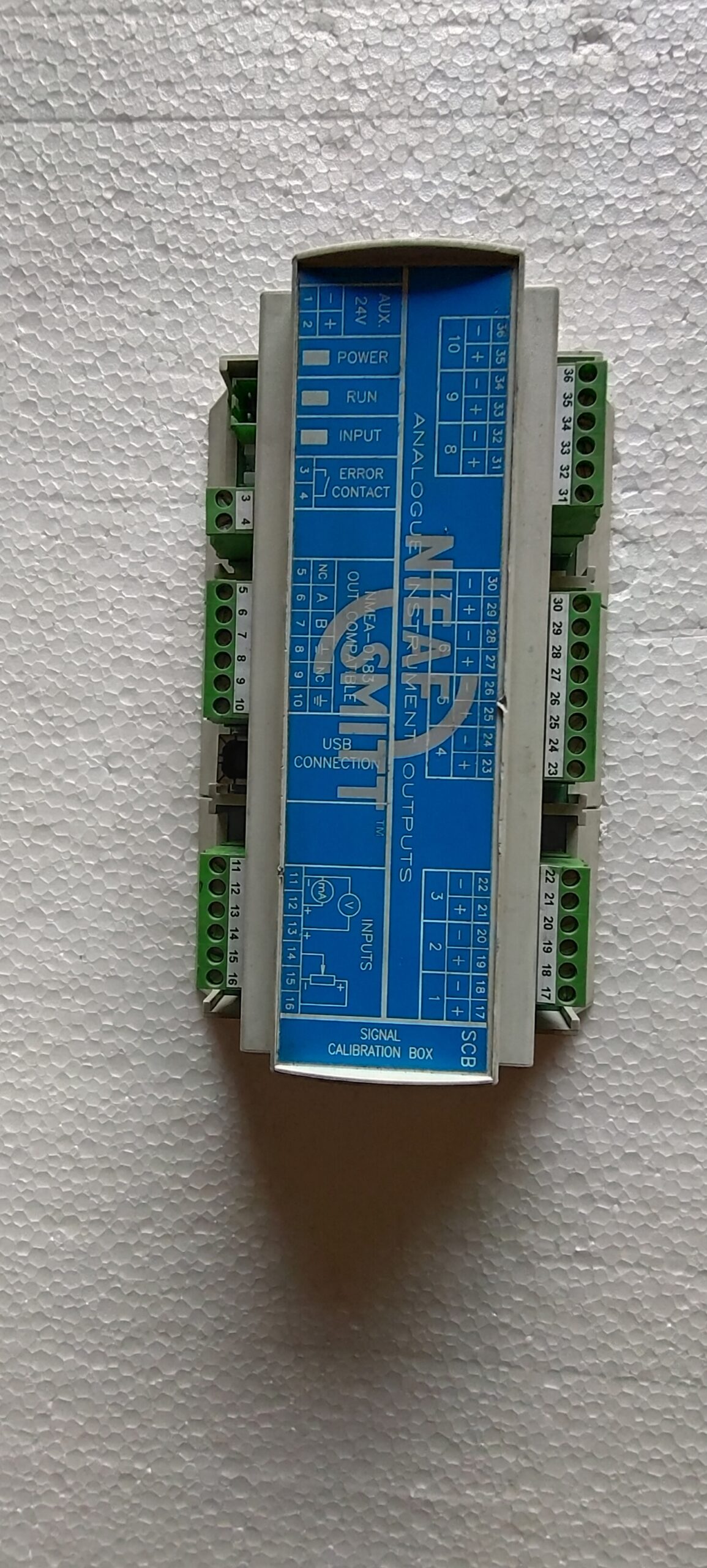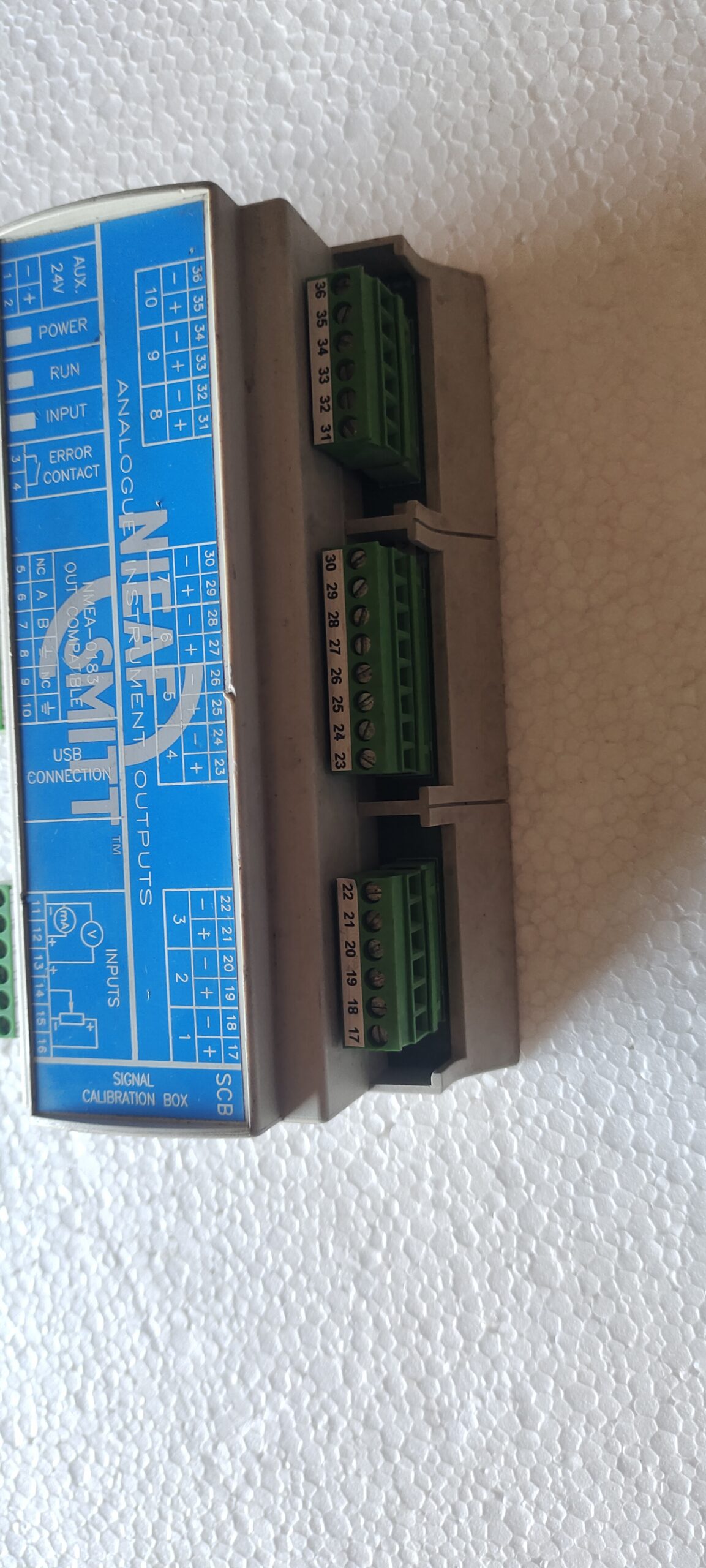 The Raytheon Anschütz (Nieaf Smitt) SCB-RAI 10 Signal Calibration Box is a marine-grade unit designed to receive, calibrate, and convert rudder angle sensor signals for up to 10 analog indicators and one NMEA 0183 output. It ensures accurate rudder position display by allowing for individual calibration of indicators, featuring 35mm rail mounting, a USB port for PC-based configuration, and compatibility with various feedback units.